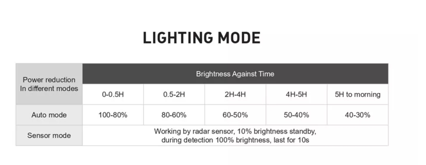 Our product offers three brightness modes: radar mode for all-night operation, constant lighting mode for all-night operation, and an option to switch to radar mode after using constant light mode.